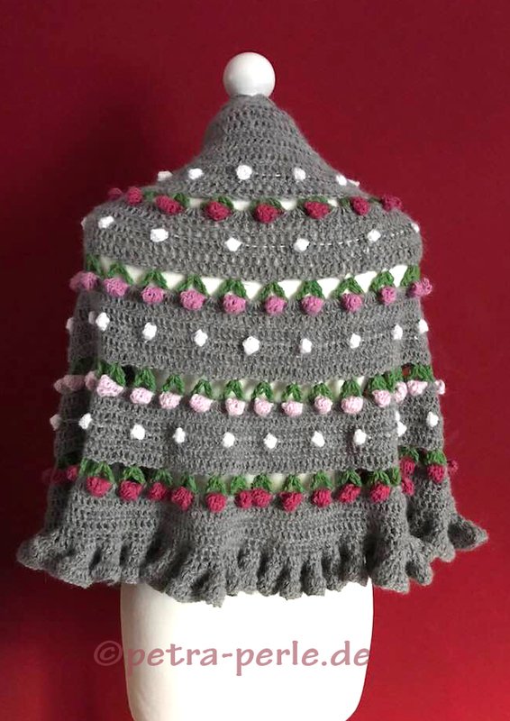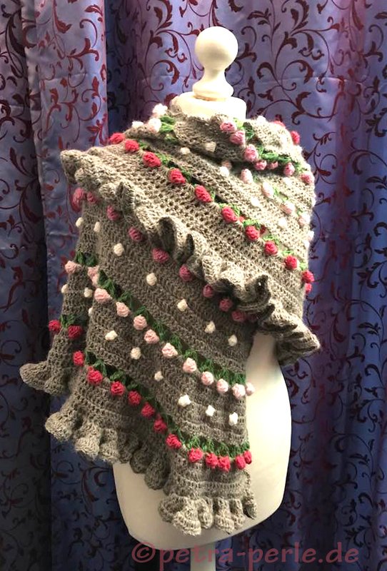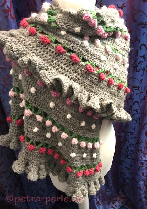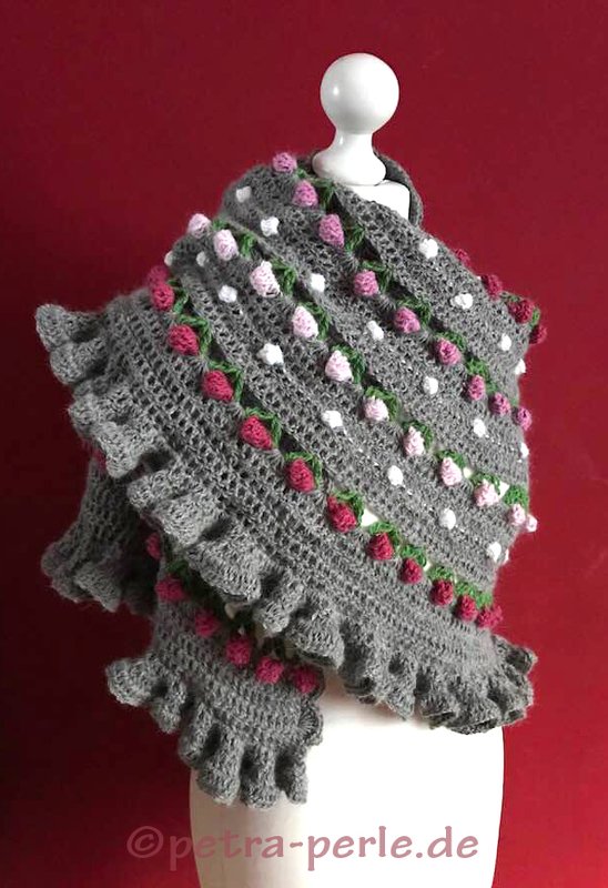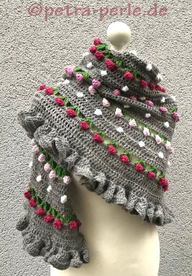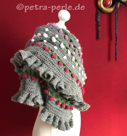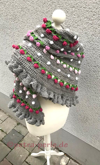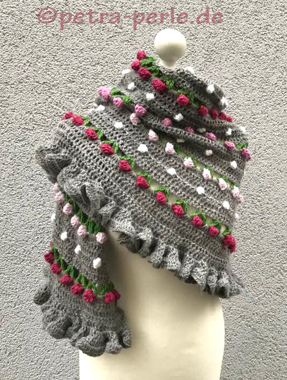 Das Tuch wird halbrund gehäkelt mit weißen Punkten und einem bezaubernden Tulpenmuster! und es ist schon ein erster Frühlingsgruß---aber Dank der tollen Wolle herllich kuschelig und warm!