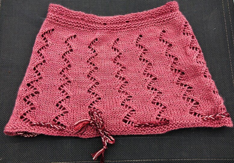 Es ist eine Kombi aus Mütze und Cowl geworden. Ein Strang, also 50 g reichen aus, um einen Cowl zu stricken, der mit einer Kordel dann zur Mütze wird. 50g haben 145m LL.
