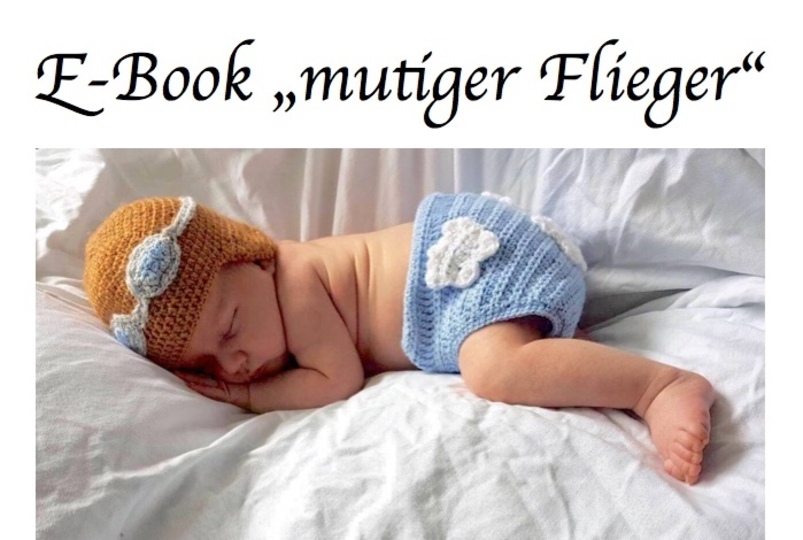 -Wolle: Wollstärke 5-6 (Verbrauch ca. 50-100 g in Braun für die Mütze, ca. 100g in Hellblau für das Windelcover, Reste in Weiß für die Wolken und Reste in Grau und Hellblau für die Brille )