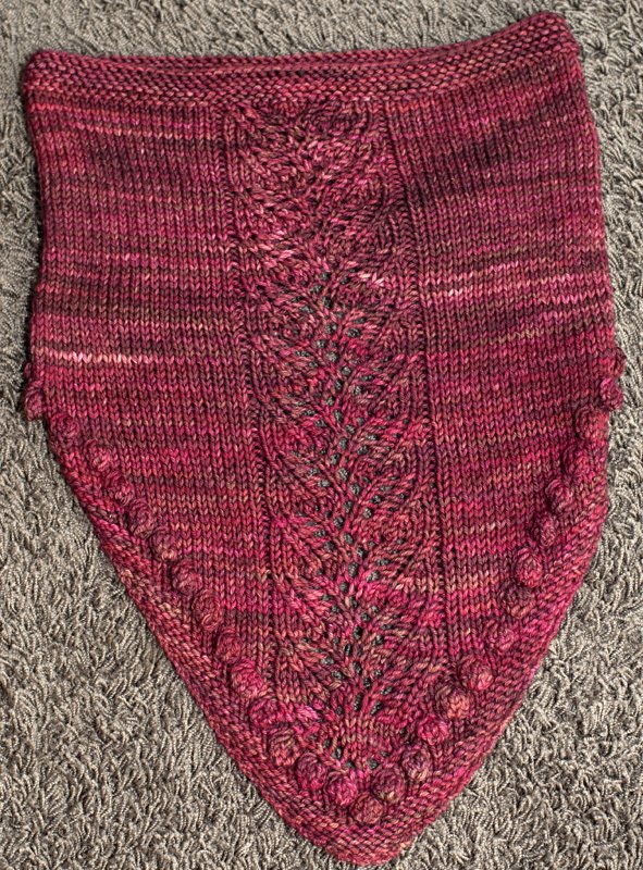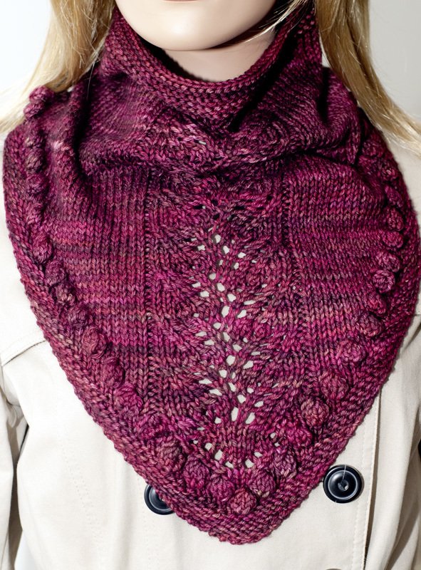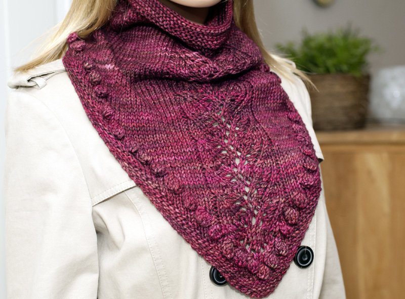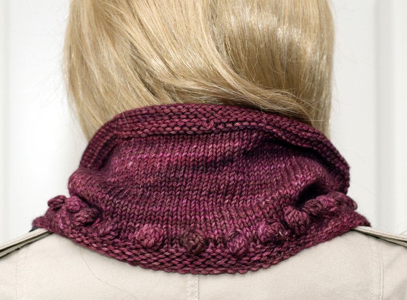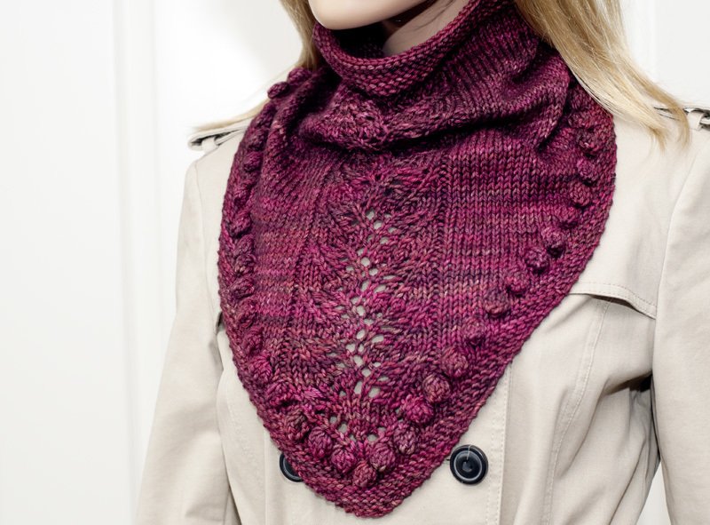 Ein Cowl, der den Nacken schön warm hält, ohne am Hals zu eng zu sitzen. Das untere Dreieck wird zunächst in Reihen gestrickt, anschließend wird der Cowl in Runden beendet. Hingucker sind die 5maschigen Noppen und der mittlere Lacemusterstreifen. Beide sind relativ einfach zu stricken, sodass dieser Cowl ein perfektes Projekt auch für Anfänger ist.
