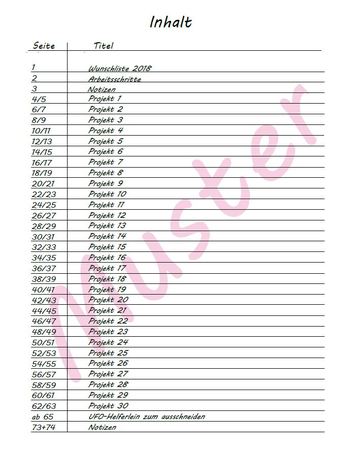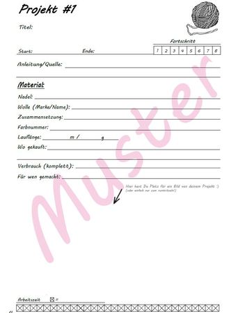 Du findest im Projektbuch ein vorgefertigtes Layout mit Deckblatt, Inhaltsverzeichnis und je 1 Projektplan auf einer Seite. Hier kannst du für jedes Projekt den Titel, die Quelle der Idee, die verwendete Nadelstärke und das Datum für Start und Ende eintragen. Außerdem stehen dir eine Materialliste, ein Fortschrittsbalken und die Übersicht der Arbeitszeit zur Verfügung.