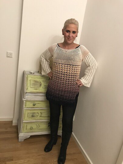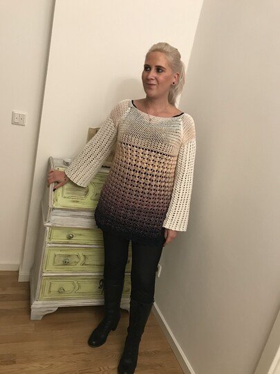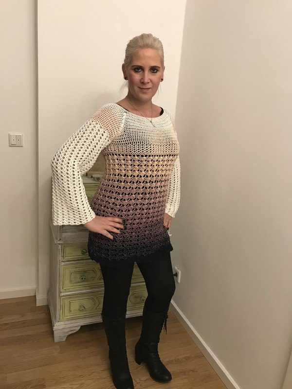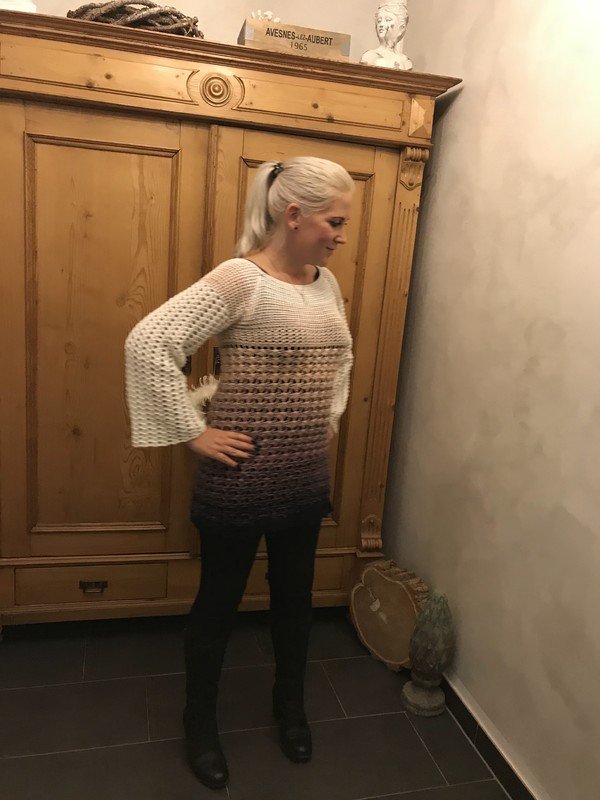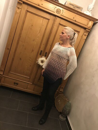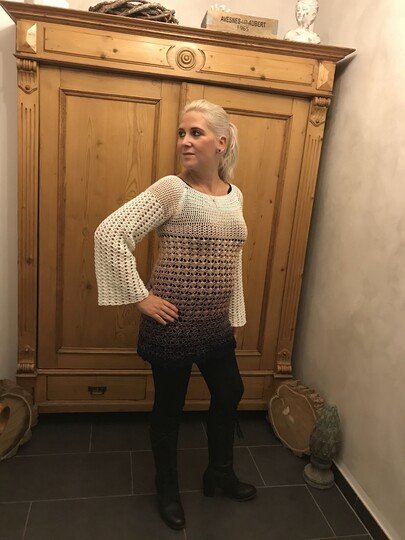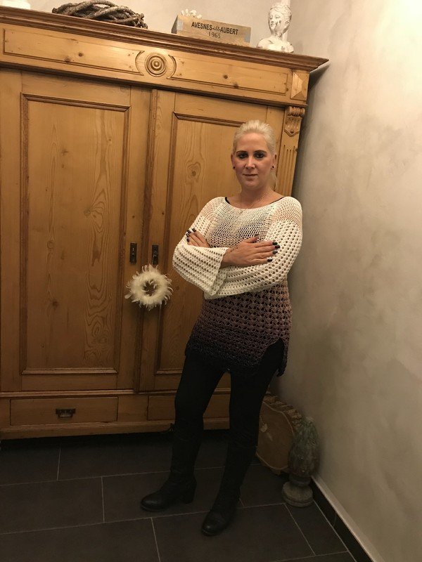 Garn: beliebig Ich empfehle: Bobbel 4-fädig, bei Größe 38/40 etwa 1000 m plus 250 m je Arm, je weitere Größe empfehle ich 300 m mehr, ich habe mit einem **Bobbel von mit dem Namen Eleganz gearbeitet Nadelstärke: 3,5 Du benötigst: Schere, 4 Maschenmarkierer Kenntnisse: Luftmaschen, Kettmaschen, feste Maschen, Stäbchen