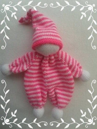 Das fertige Püppchen ist je nach Festigkeit beim Stricken ca. 18 cm groß