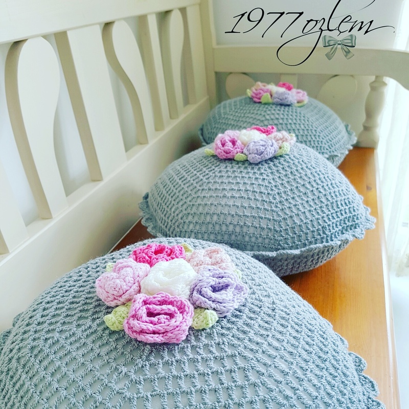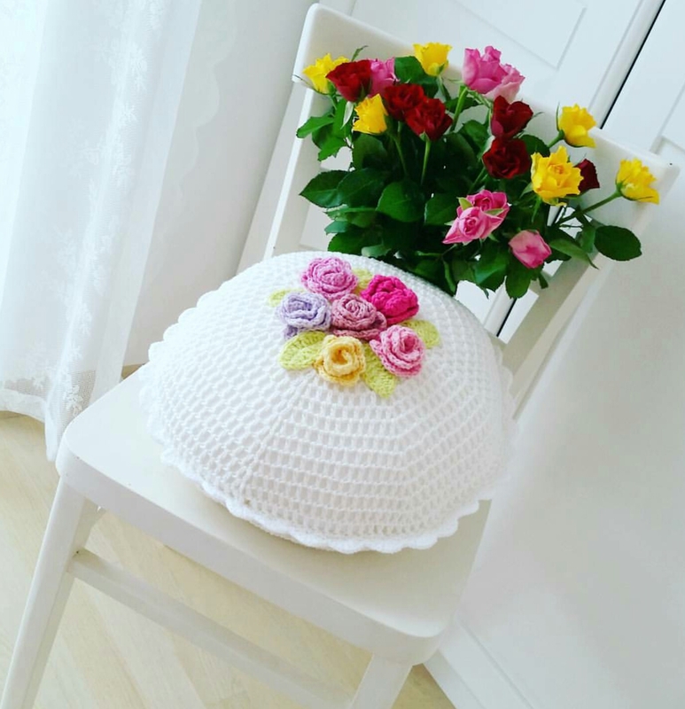wunderschöner shabby Häkelkissen mit Rosen und Blättern