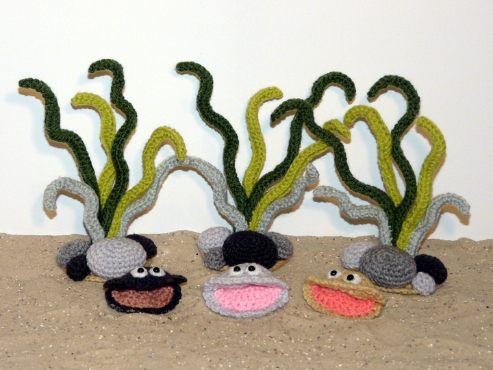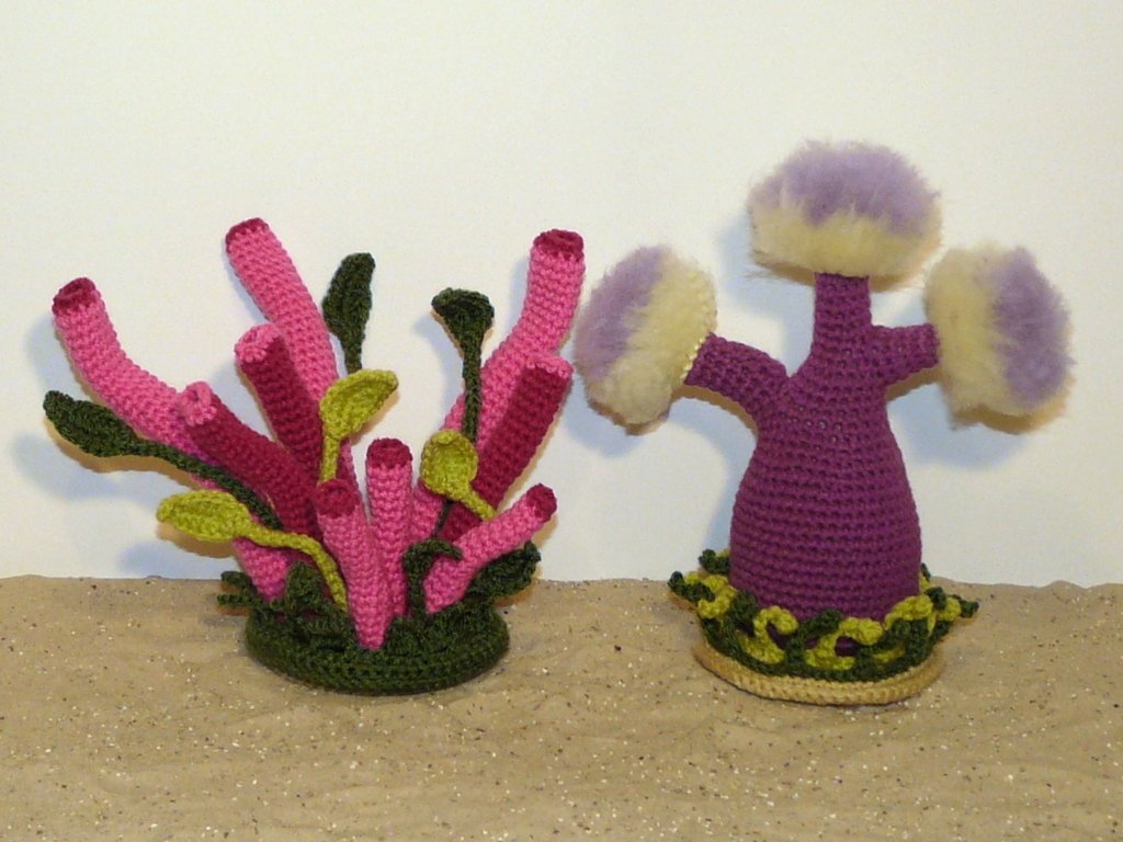 Je nach Garn- und Häkelnadelstärke variiert die Größe von den Seepferdchen, den Muscheln und den Korallen.