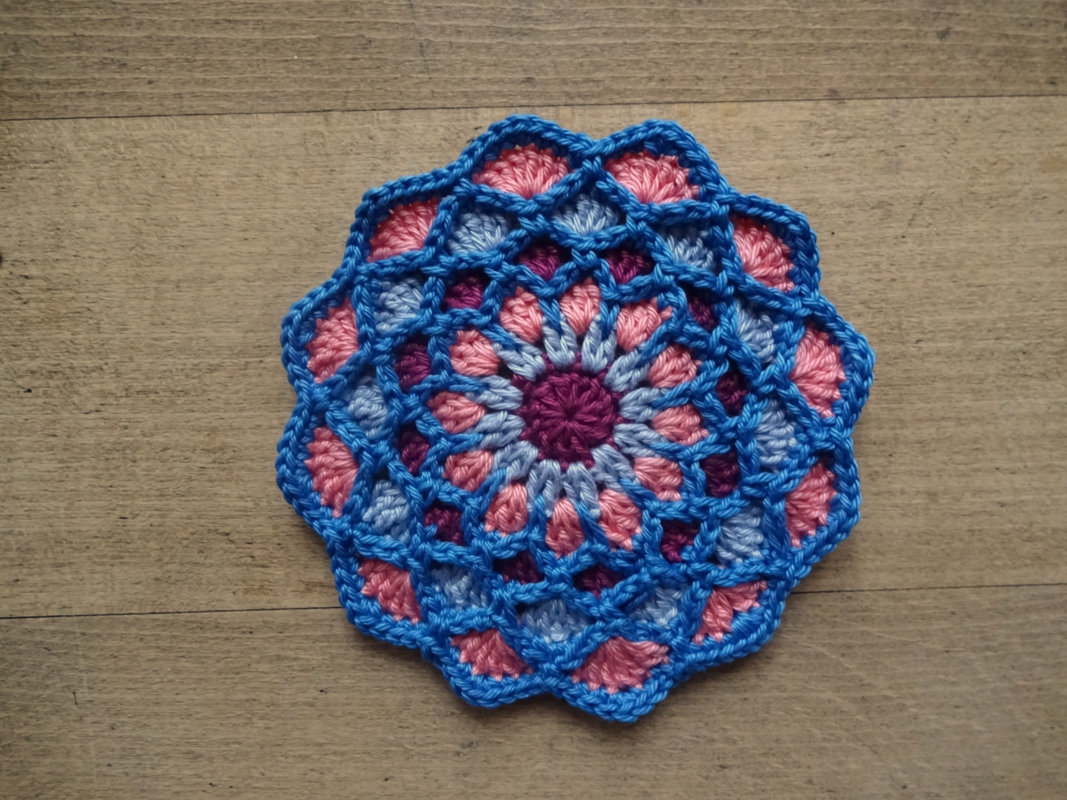 Hier kommen meine kleinen Mandalas, ca 12 cm im Durchmesser, die ein wenig an die Tiffany- Glaskunst erinnern. Farbige Flächen sind kontrastreich umrahmt, so sieht jedes einzeln gehäkelte Teil immer wieder anders aus.