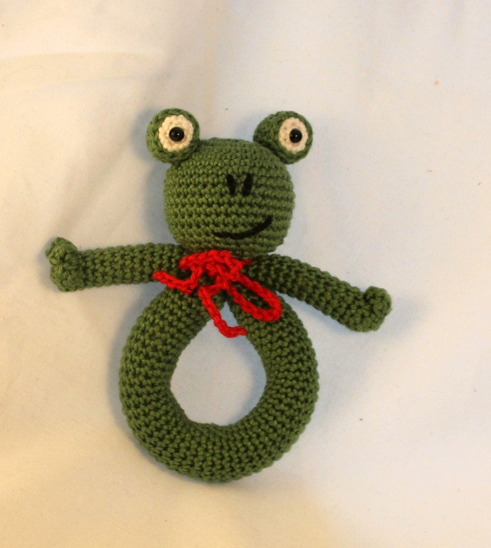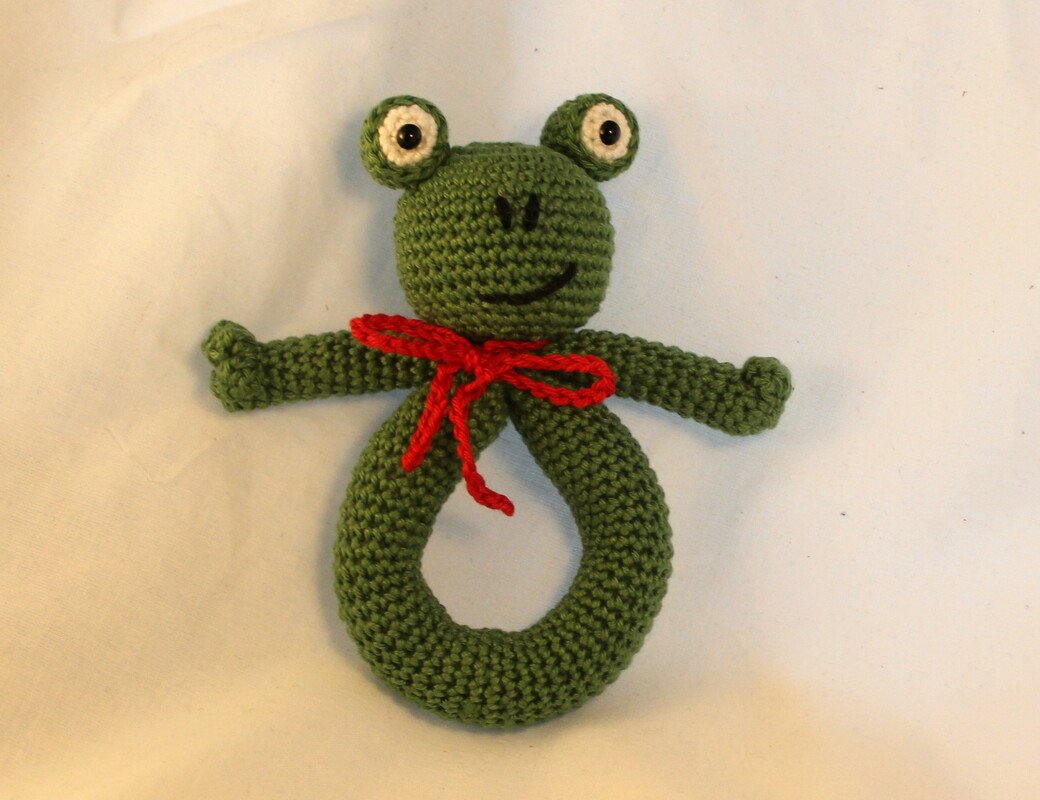 Die Froschrassel hat eine kleine Rasselkugel eingebaut, und sowohl der Ring ist super geeignet für Babies kleine Händchen.