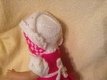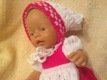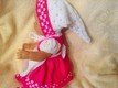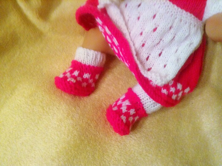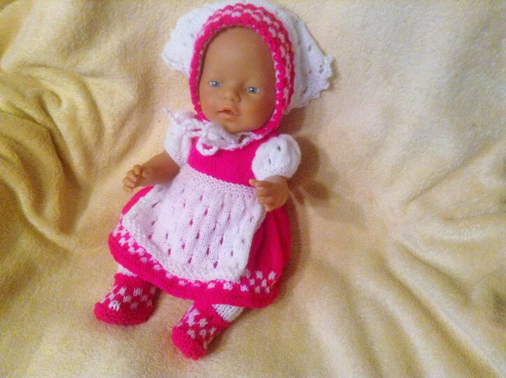 Eine Strickanleitung für ein Dirndl- Set für Puppen Gr. 42/45. Das Set besteht aus einem Dirndl mit Schürze, einem Mützenkopftuch und Söckchen.