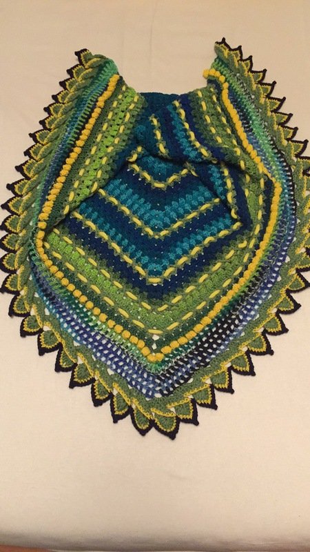 Dieses einfache Häkeltuch wird im Großen und Ganzen aus Stäbchengruppen, verkreuzten Doppelstäbchen und Popcornmaschen gearbeitet.