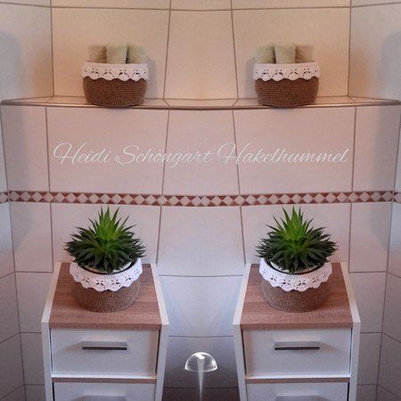 Die Anleitung erfordert am Anfang etwas Ausdauer und Geduld, weil in den Anfangsrunden die Maschen aus Jutegarn / Paketband oder Baumwollgarn fester sind durch das Verdoppeln der Maschen.