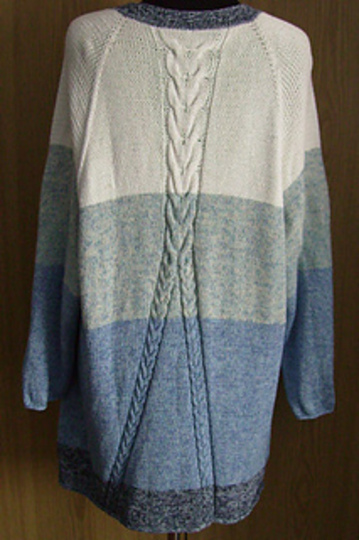 Eine einfache Weste oder Jacke, die man gut aus den Resten anderer Projekte stricken kann. Sie läßt sich gut an alle Kleidergrößen anpassen. Sehr schön ist auch das Muster am Rücken.