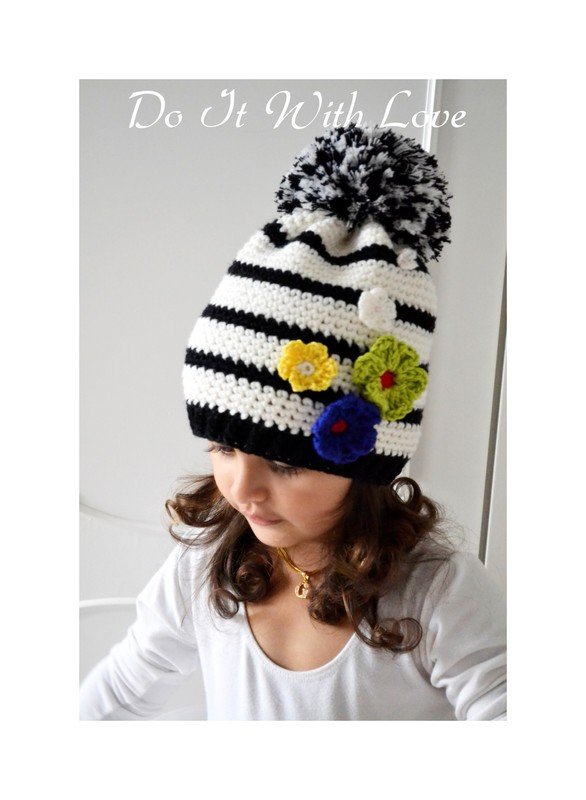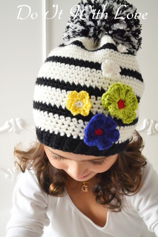 Diese Bommelmütze "Stripes & Flowers" ist handgearbeitet und für den höchsten Komfort sowie viel Wärme designed.