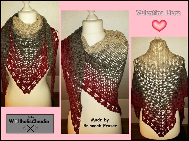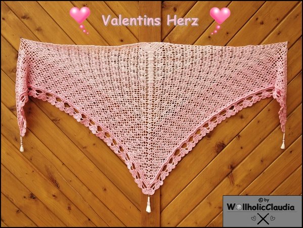 Mit diesem "herzigen" Tuch kannst du dich- oder einen anderen lieben Menchen z.B. am Valentinstag oder zur Hochzeit beschenken. Der aus Herzen bestehende Abschluss sagt mehr als 1000 Worte. Das einfache- aber wirkungsvolle Muster geht wirklich schnell von der Hand und das Beste: Du kannst Valentins Herz so groß häkeln, wie du möchtest. So kann der vorhandene Bobbel komplett ausgenutzt werden.