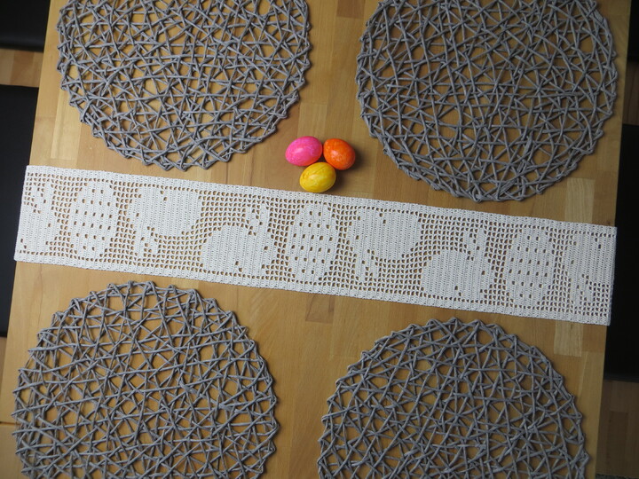 Mit dieser Anleitung können auch schon Anfänger diese hübsche Tischband mit Ostermotiv häkeln.