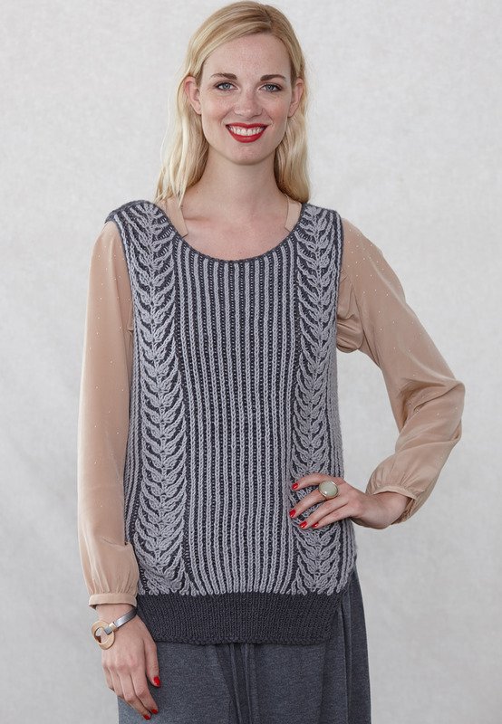 Der Pullunder fristet ein Nischendasein? Falsch! Neu interpretiert und ausgefallen designt wird dieses Basic absolut einzigartig. Es wird in Brioche-Technik = 2-farbiges Patentmuster und mit Zöpfen gestrickt.