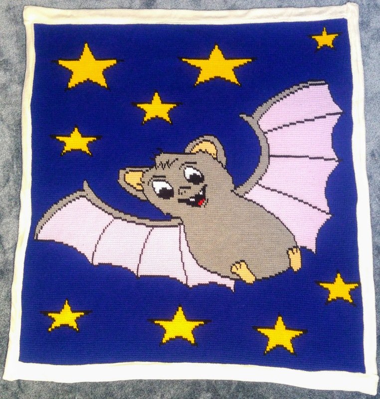 Die Decke ist 1.2m x 1,45m groß. Die Anleitung beschränkt sich auf die Häkelvorlage. Es wird nicht beschrieben wie man die hintere Decke annäht.
