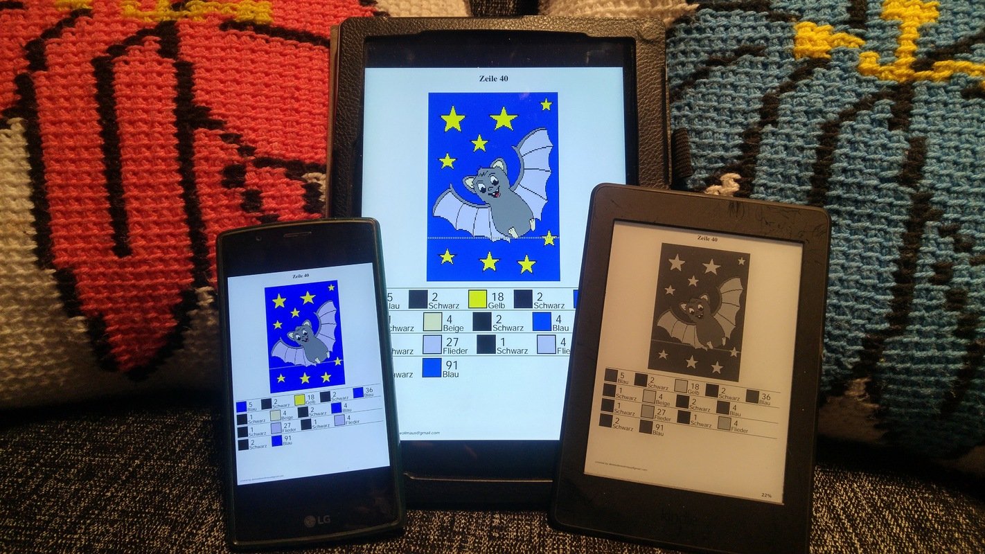Die Anleitung enthält zusätzlich eine PDF Datei mit der genau abgezählten Maschenanzahl jeder Farbe pro Reihe. Diese Datei kann auf Tablet und / oder E- Book Reader geladen werden um auch unterwegs bequem häkeln zu können. :)