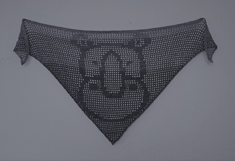 Das Tuch wurde mit ca. 330 Metern; 3- fach gefachtes Farbverlaufsgarn und einer 3er Nadel gehäkelt. Das Tuch ist ca. 115 cm lang und ca. 55 cm breit.