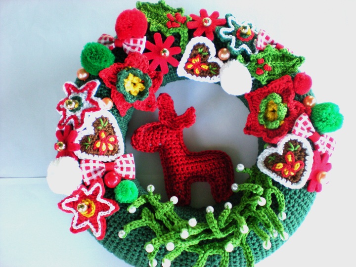 Zusätzlich zu den Häkelelement, kann man seiner Fantasie freien Lauf lassen. Ob Schleifen, Perlen, Filzstreuteile odere andere Bastelteile in den passenden Farben kann man mit einbringen. Natürlich muss es nicht rot-grün-weiß sein, man kann den Kranz auch individuell nach seinen Farbwünschen gestalten.