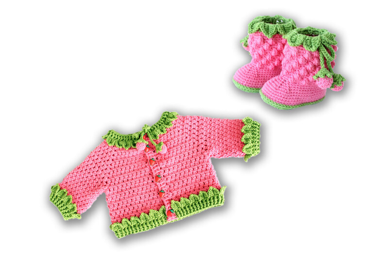 Zwei PDF-Häkelanleitungen bestehen aus bebilderten Anleitungen zum Häkeln von Babystiefel, Gr. 0-12 M, und Babyjacke, Gr. 50-116.