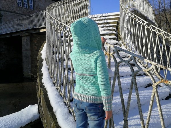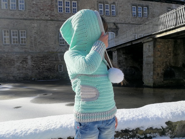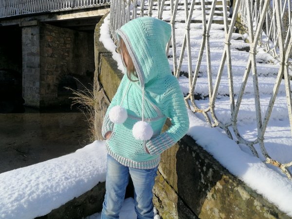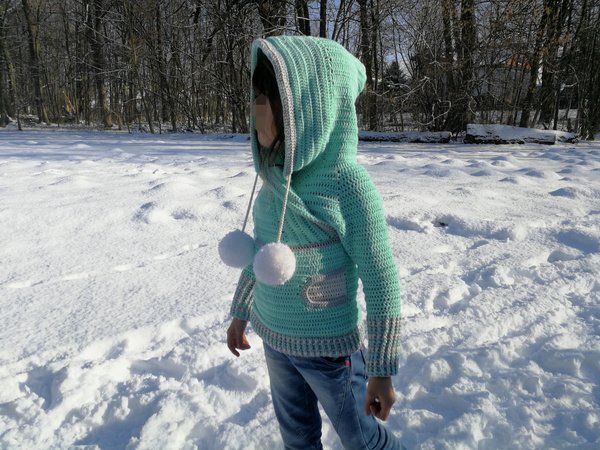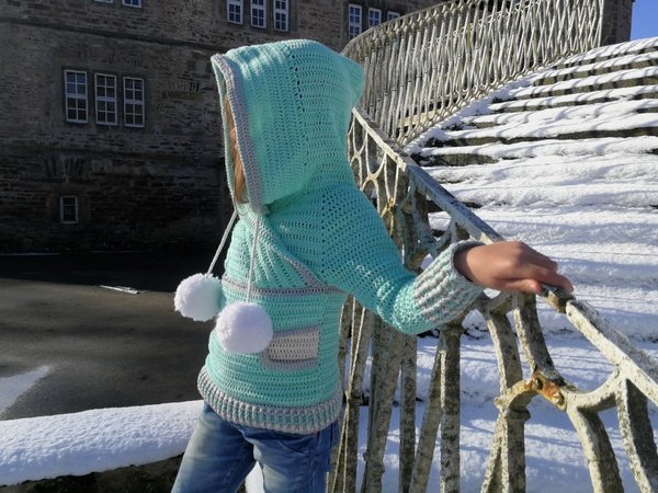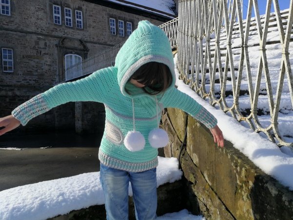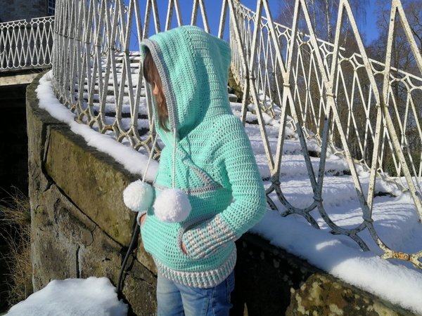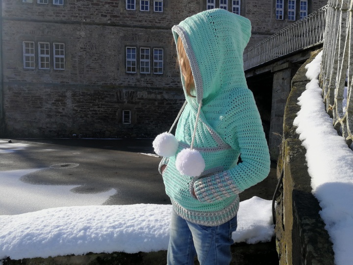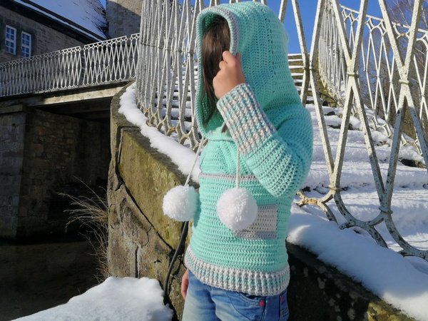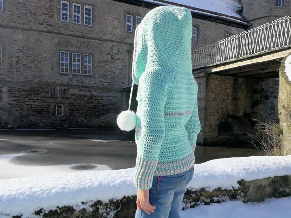 Der coole Schnitt ist zeitlos und für jedes Geschlecht geeignet. Die großen Bommel kannst du für einen Damen oder Herrenpullover einfach weg lassen. Kleine Eingriffstaschen sorgen dafür, das man seine Hände kurz aufwärmen kann, oder Kleinigkeiten lassen sich in der Tasche verstauen. Die große Kapuze ist typisch für den Hoodie und lässt sich auf die Kopfweite durch Kordeln zusammen ziehen!