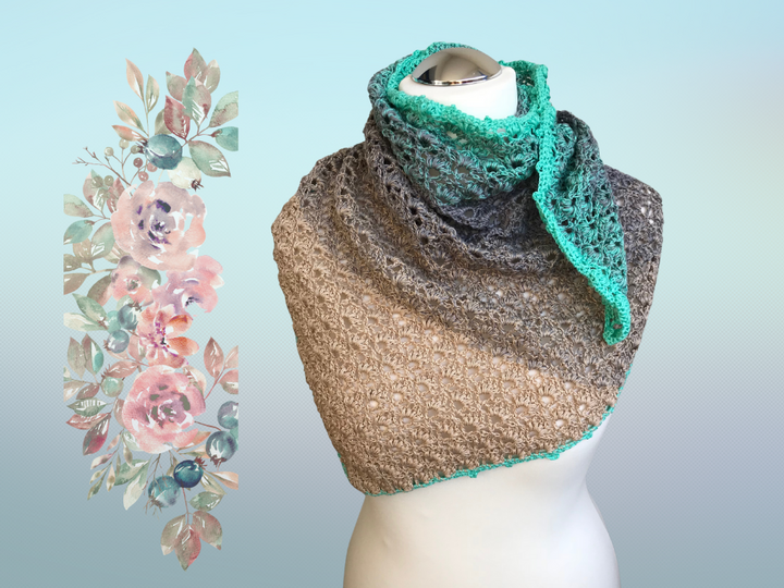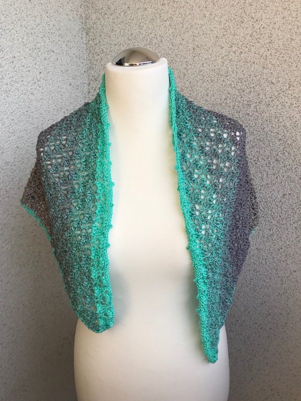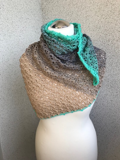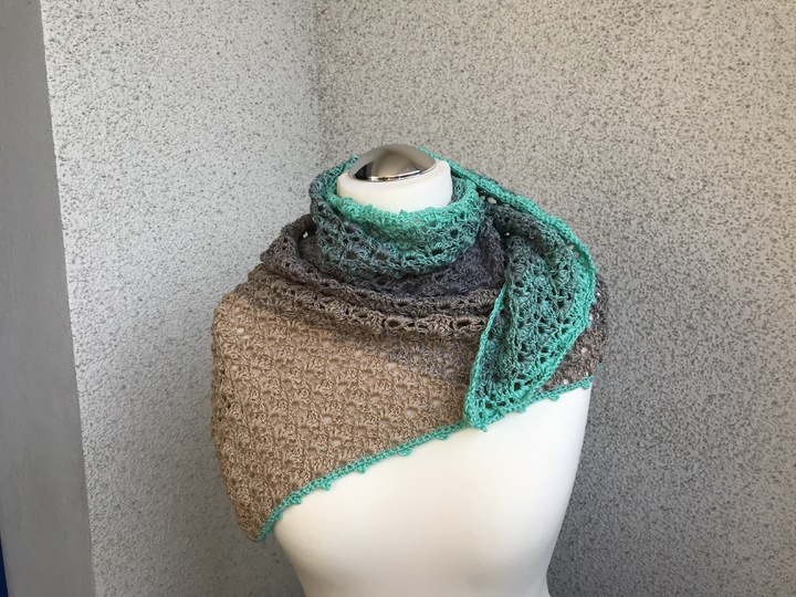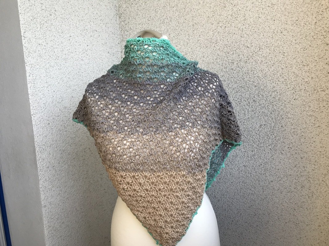Dieses verspielte Dreieckstuch wird mit einem Bobbel (150g) 3-fädigen Farbverlaufsgarn gehäkelt. Büschelmaschen werden muschelförmig gearbeitet und ergeben dieses tolle Muster.