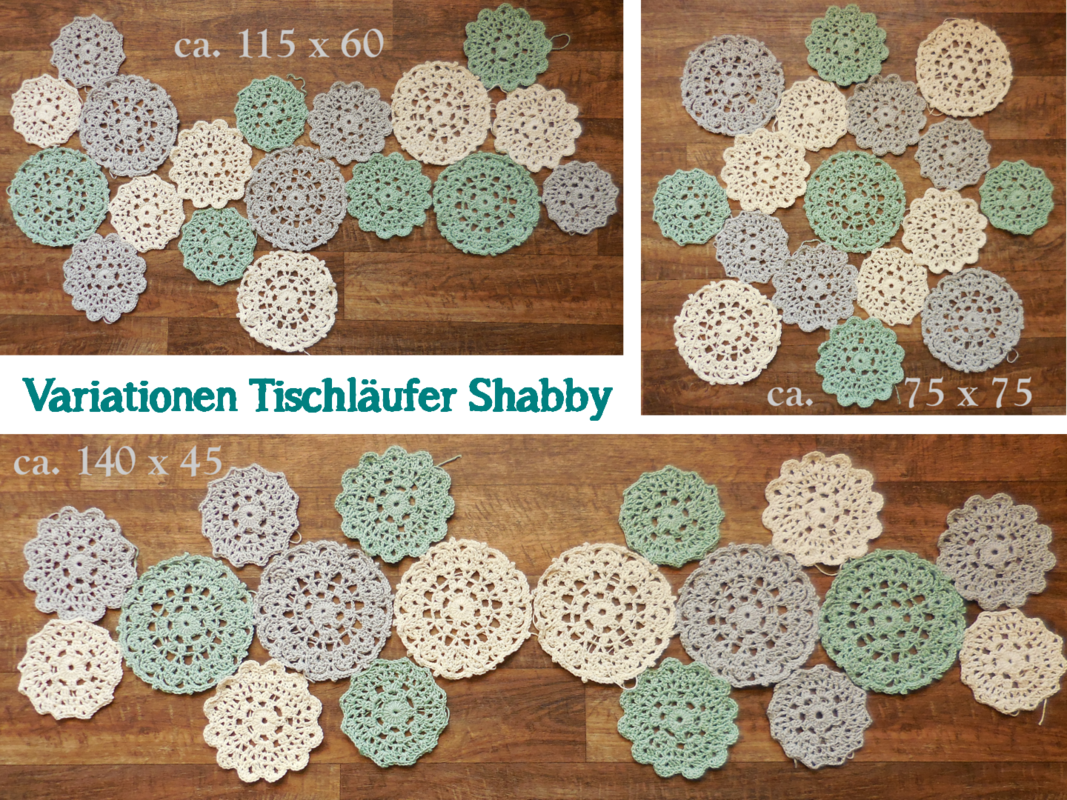 je nachdem, ob Du Deinen Läufer so gestalten möchtest wie ich oder ob Du die Deckchen ganz anders nach Deinen eigenen Ideen zu einer Fläche zusammen fügst - länger, kürzer, rund oder oval als Tischdecke usw. - kannst Du die Menge und die Farbwahl der einzelnen Deckchen selbst bestimmen.