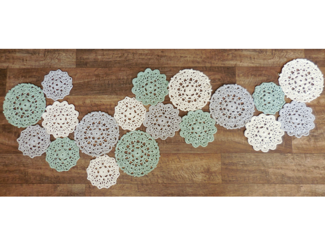 Der Tischläufer besteht aus 3 verschieden großen Retro-Deckchen (Ø 13cm, Ø 16cm und