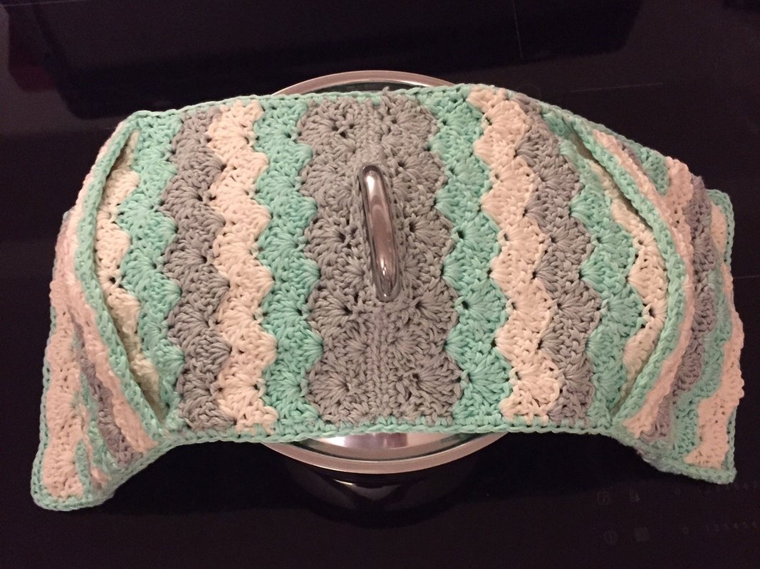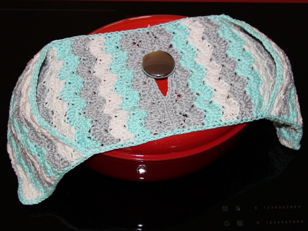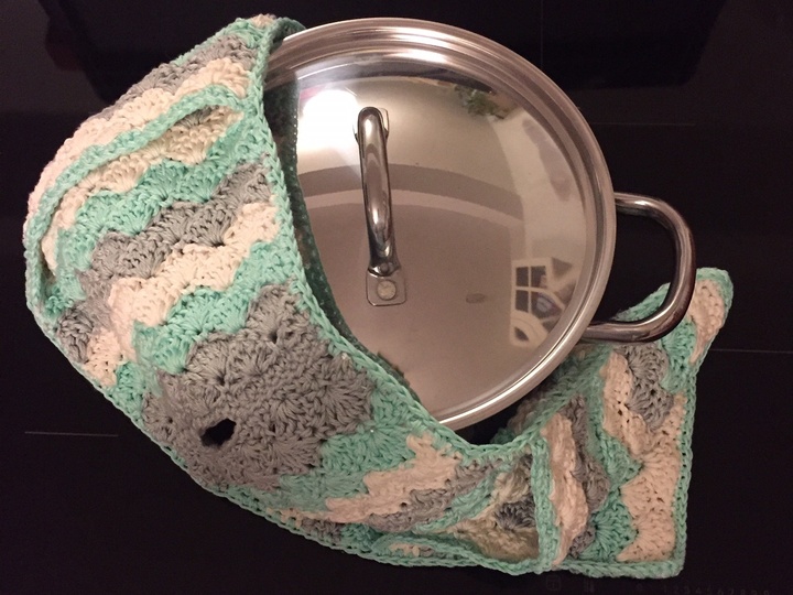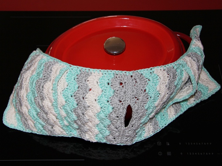 Dieses Topflappenset besteht aus einem extralangen Topflappen mit Eingriffen (~62 x 21 cm) für die Hände und Öffnung für den Deckelknauf/Deckelgriff und einem klassisch runden Topflappen (~ 24 cm im Durchmesser).