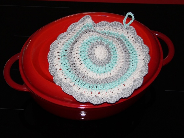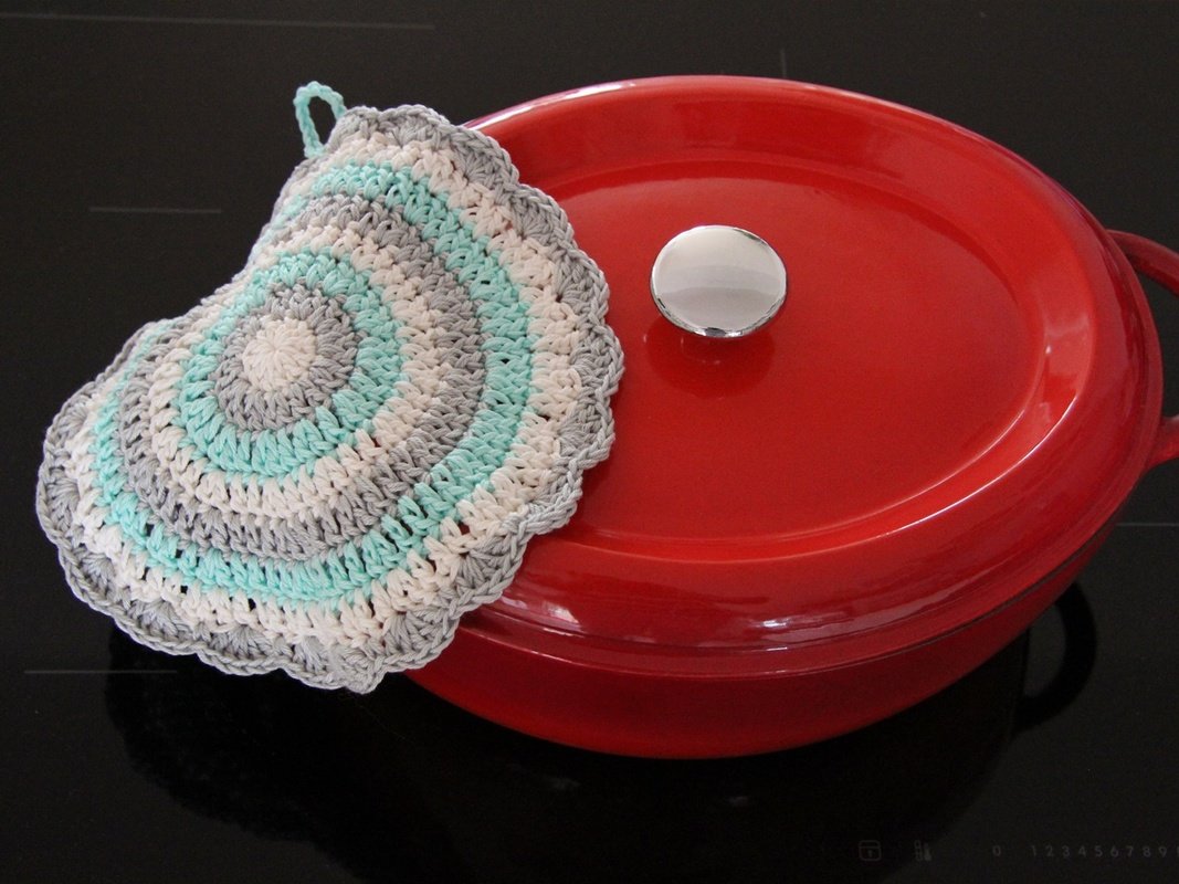 Der klassisch runde Topflappen ist nicht nur für alle Gelegenheiten, zu denen man einen Deckel vom Topf nehmen oder einen Topf an einem Griff festhalten muss, ideal, sondern eignet sich auch hervorragend als Untersetzer, wenn man den Topf kurz absetzen oder z.B. auf dem Esstisch abstellen möchte.