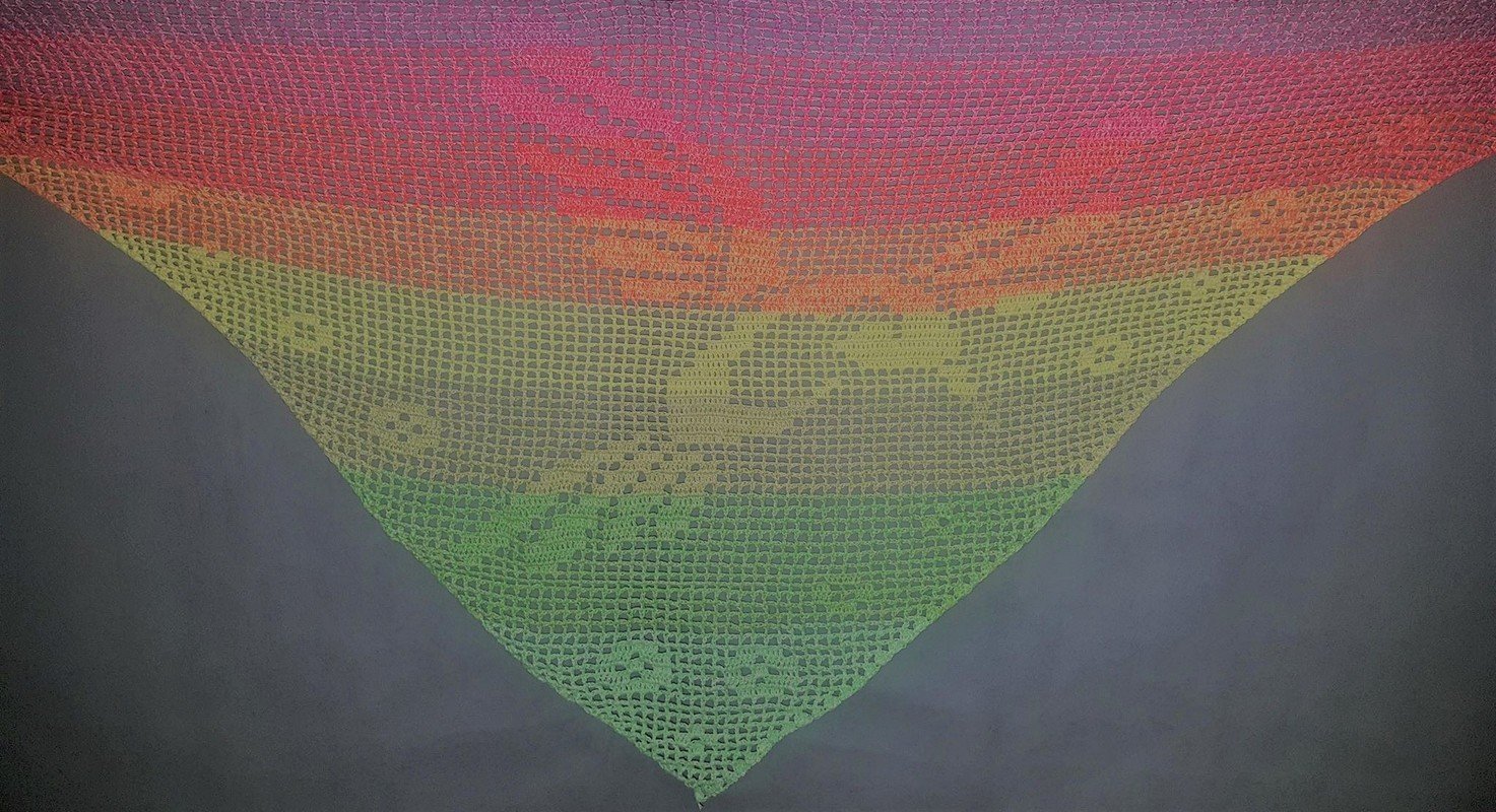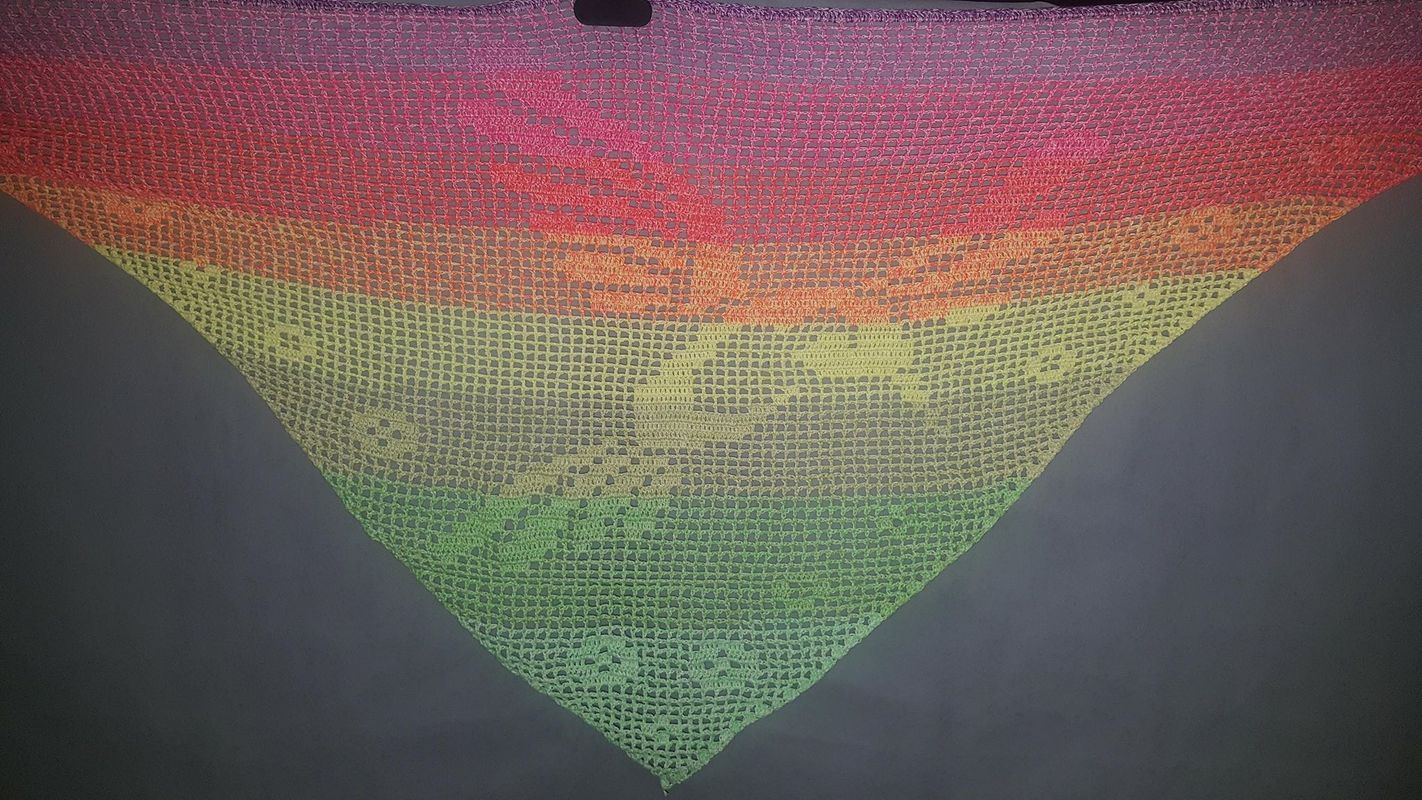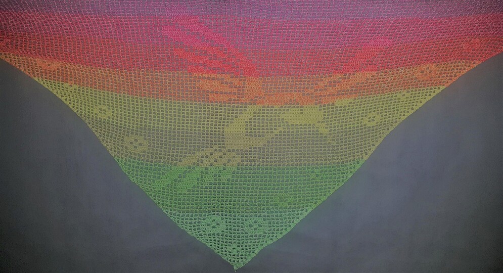 Das Tuch "Estrella" wurde mit ca. 850 Metern LL sowie 3 fädrigem Farbverlaufsgarn und einer 3er Nadel gehäkelt Es hat die Maße: ca. 174 cm x 80 cm