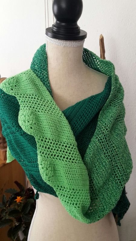 Mit den angegebenen Materialien bekommt der Schal (gewaschen und gespannt) eine Spannweite von ca. 2,30 m.