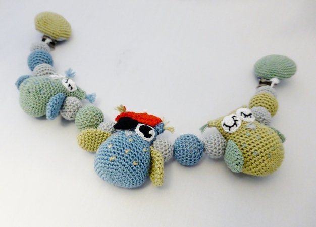 • 2 Klipper mit ca. 3.5 cm Durchmesser (um die Kette am Kinderwagen zu befestigen)