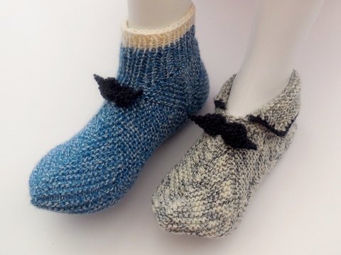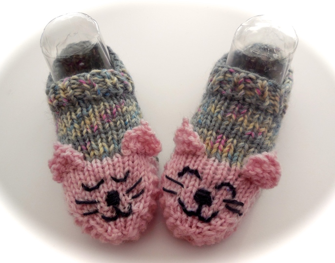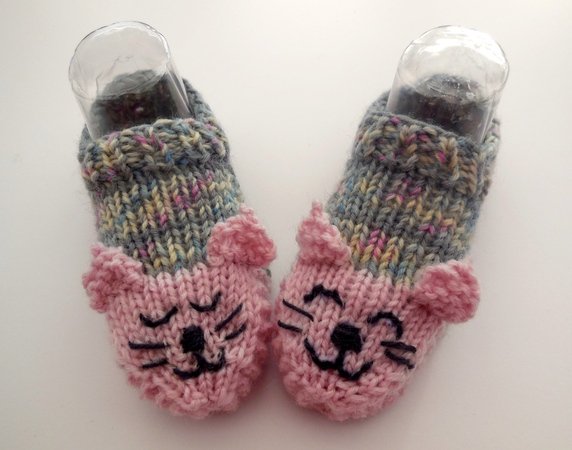 Die süßen Katzensöckchen/Hausschuhe sind ganz einfach und schnell aus Sockenwollresten gestrickt.