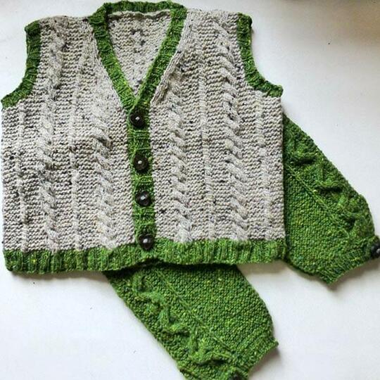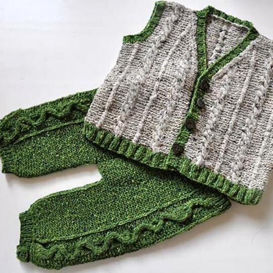 Dieser entzückende Trachtenanzug für kleine Jungs besteht aus Weste und 3/4-Hose und ist in der rustikalen DONEGAL Tweed gestrickt.