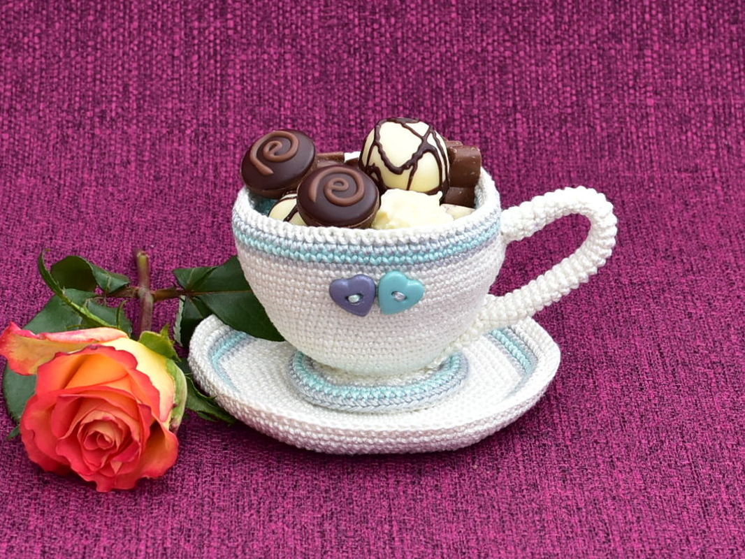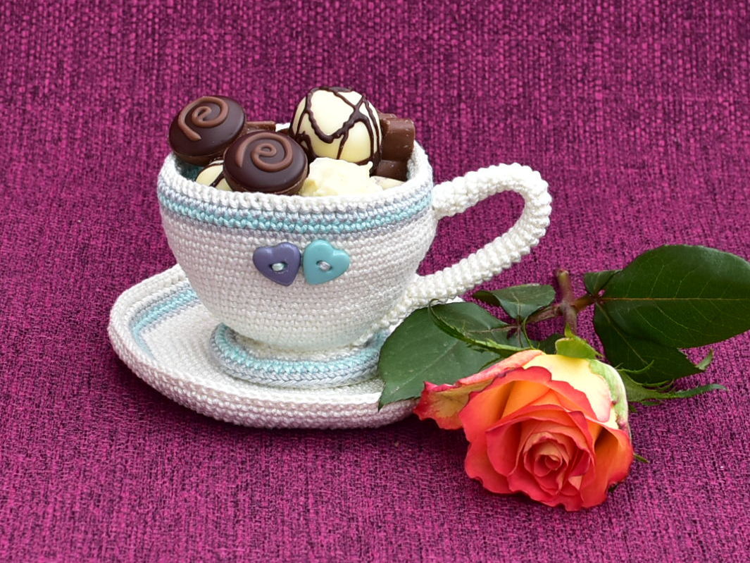 Die Sammeltassen kannst du in verschiedenen Stilrichtungen häkeln. Streudeko (kleine Blümchen, Knöpfchen oder verspieltes für die Kleinen) machen die Sammeltasse perfekt.