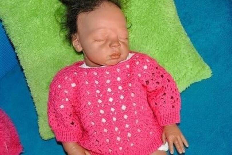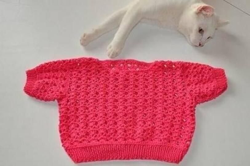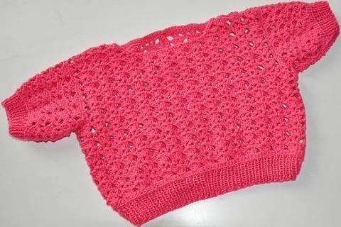 Dieser Häkelpulli wird in einem Stück gehäkelt, mit Strickbündchen versehen und hat nur Nähte an den Schultern.