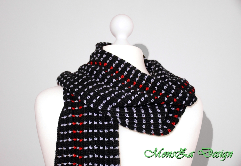 Den Schal Quattuor habe ich für meinen Mann entworfen, zum einen liebt er die Farben schwarz mit rot und grau und zum anderen gefallen ihm einfache grafische Muster.