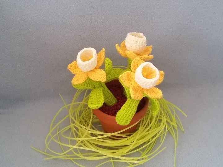 Also hol Dir doch den Frühling ins Haus und häkel Dir dieses kleine Narzissentöpfchen.