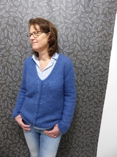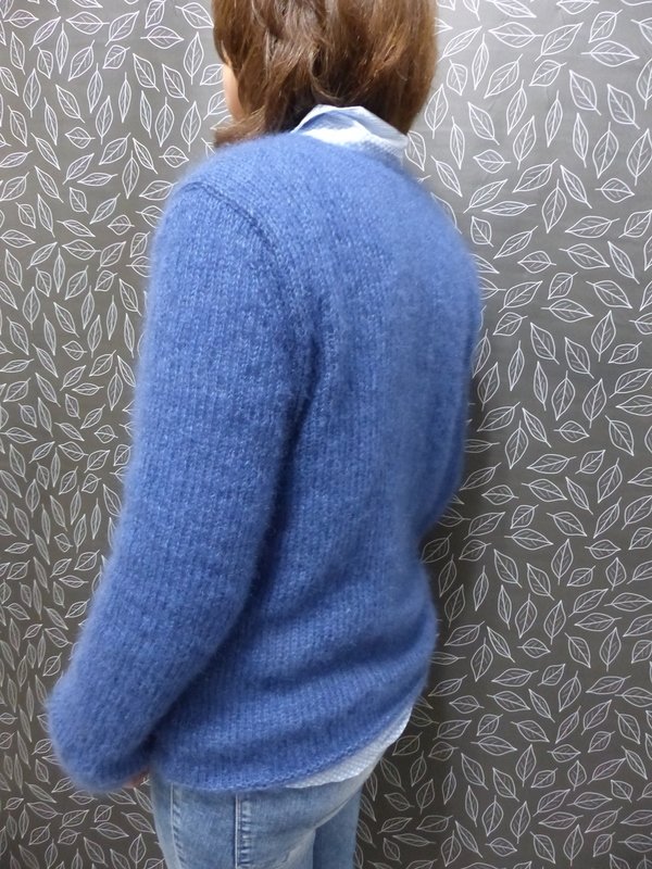 Er hat leicht ausgestellte Bündchen, einen V-Ausschnitt und vorne eine Naht.