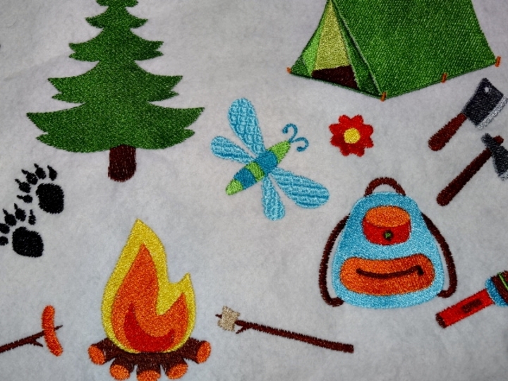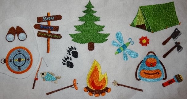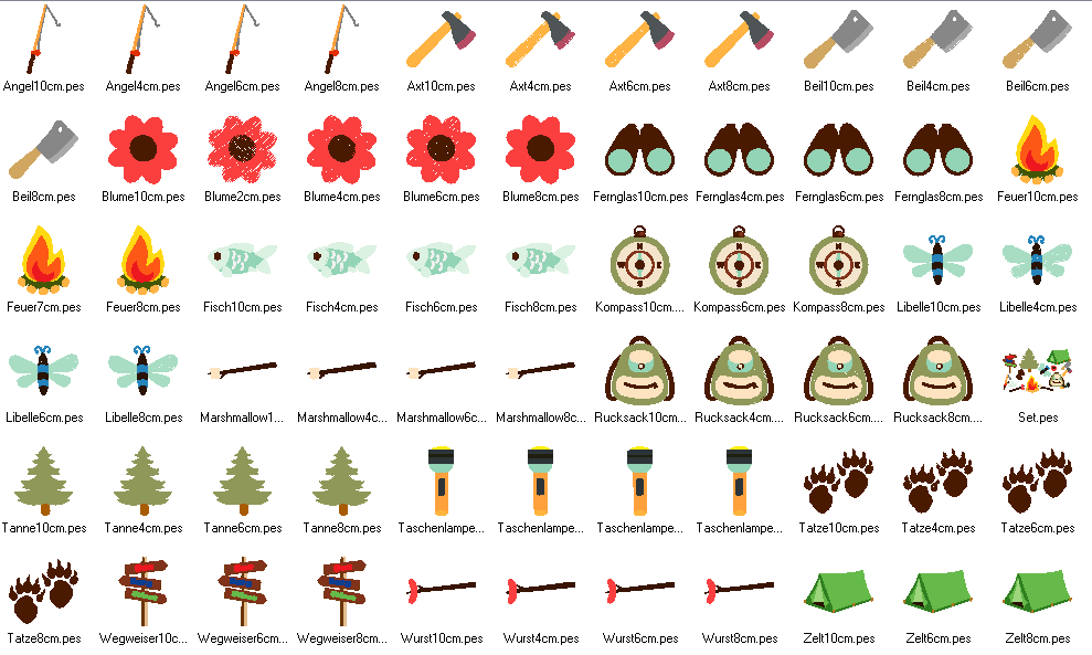 mit Angel , Axt , Beil, Blume , Fernglas , Feuer , Fisch , Kompass , Libelle , Marshmallow , Rucksack , Tanne , Taschenlampe , Tatze , Wegweiser , Würstchen und Zelt ♥