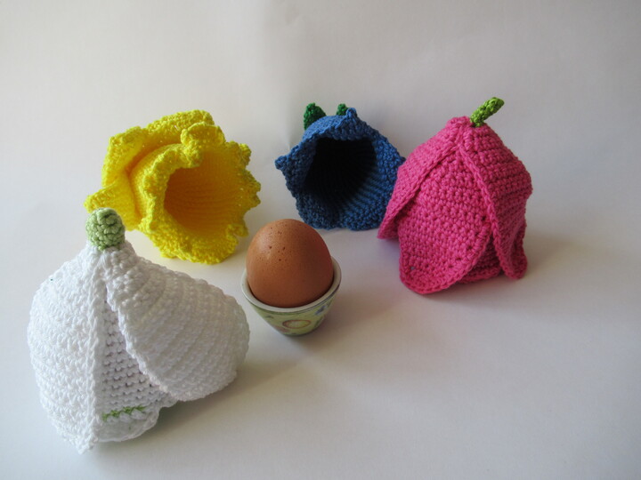 **Mit diesen Eierwärmern wird der Frühstückstisch zu einer bunten Frühlingswiese! Häkle dir die Blüten von Osterglocke, Glockenblume, Schneeglöckchen und Tulpe und du hast eine wunderschöne Tischdekoration - mit und ohne Eier- und nicht nur in der Osterzeit.