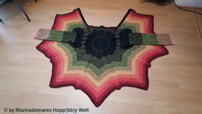 Runde 12: Hier soll ich zwischen den 2 Stb 1 M auslassen (wo gar keine M ist). Außer ich häkle in die 2 Zwischenräume der 3 Stäbchen die 2 Stäbchen. Das muss ich aber in den nächsten Reihen weiterführen (in die Zwischenräume - nicht in die M häkeln), sonst werden "Berg + Tal" unterschiedlich.