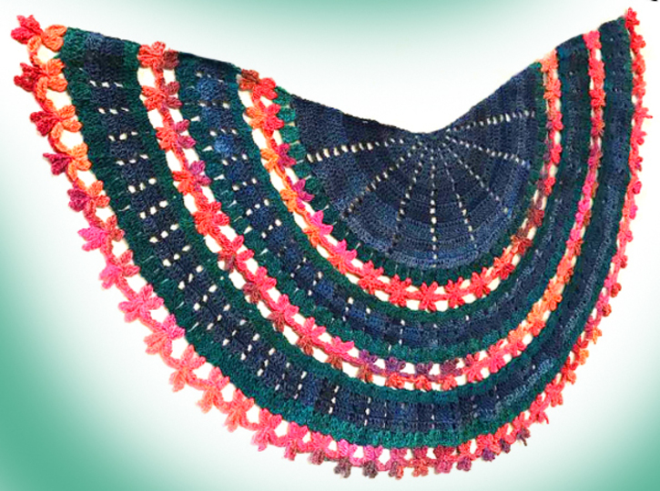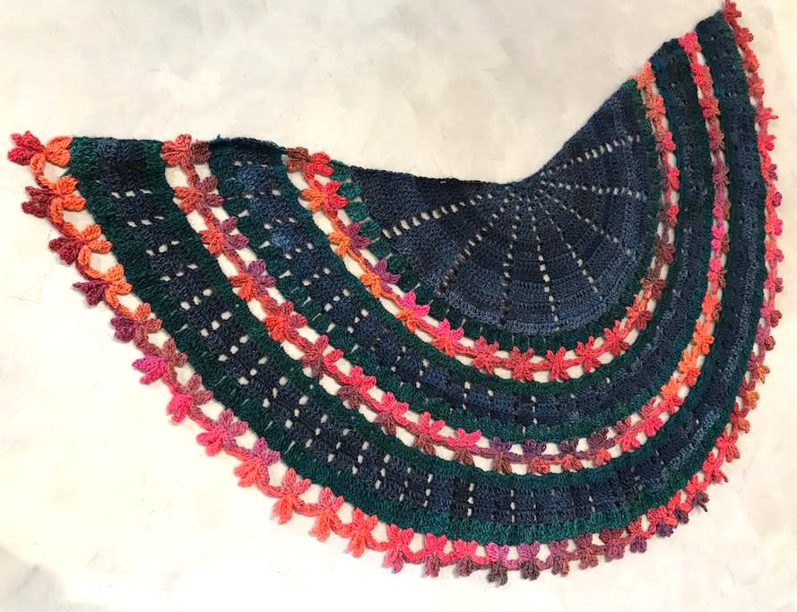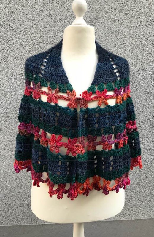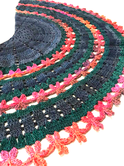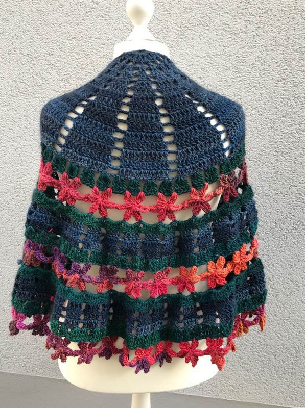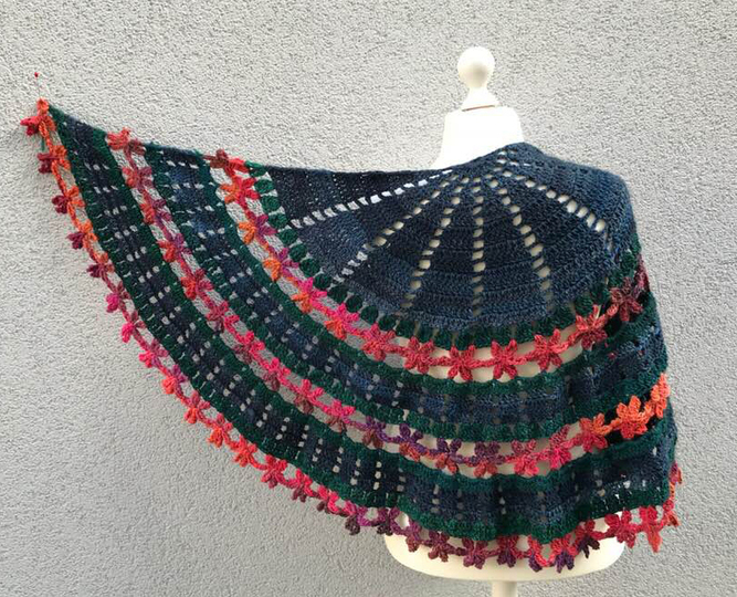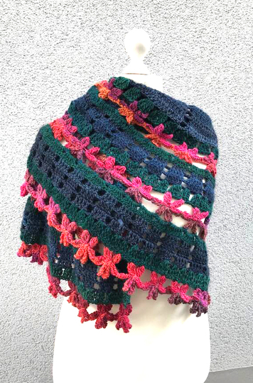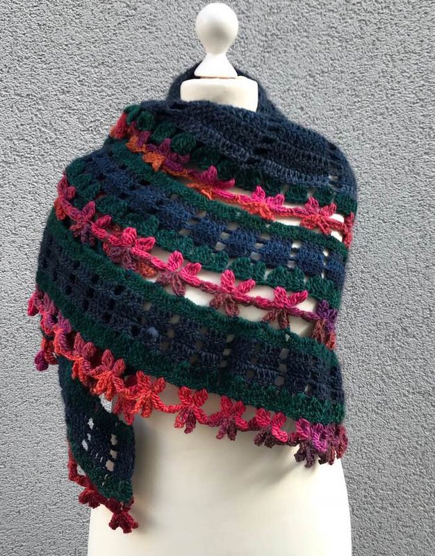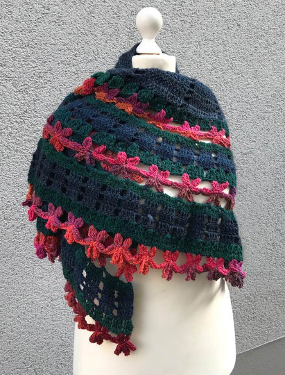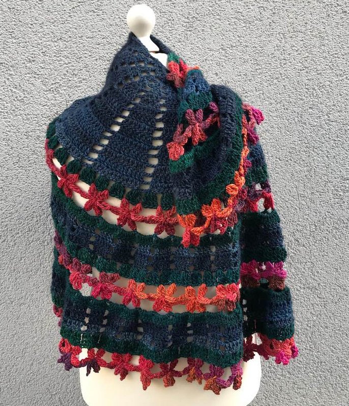 Das Tuch "Blütenreigen" sieht um den Hals geschwungen bezaubernd aus und macht schon so viel Freude bei der Herstellung. Ich nehme eine fluffige Wolle mit Rotverlauf (LANG Mille Colori), damit die auch Blumen schön füllig aussehen!