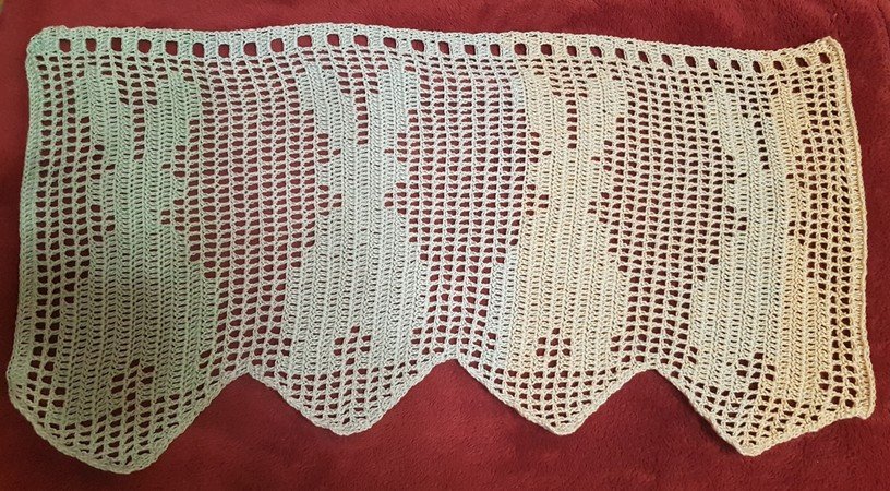 Genutzt wurde ein 3 fädiger Bobbel mit einer Lauflänge von 260 Meter und gehäkelt mit einer 3 er Häkelnadel, dann hat die Gardine die Maße 57x34 cm. Man kann aber die Gardine in der Breite individuell häkeln indem man den Mustersatz beliebig wiederholt.