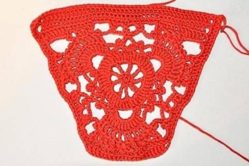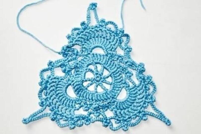 Die Anleitung umfasst das Häkelmotiv “Triangel” und eine detaillierte Anleitung für Bikini-Oberteil und -Höschen für einen “barocken” Häkelbikini.