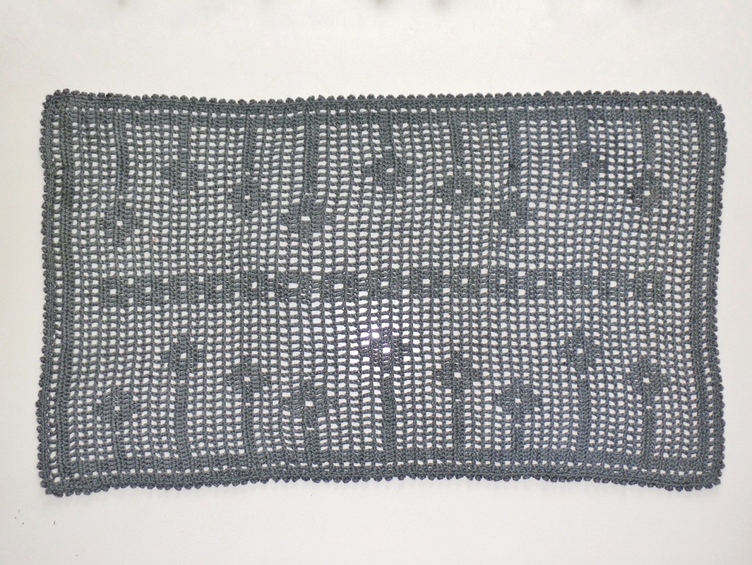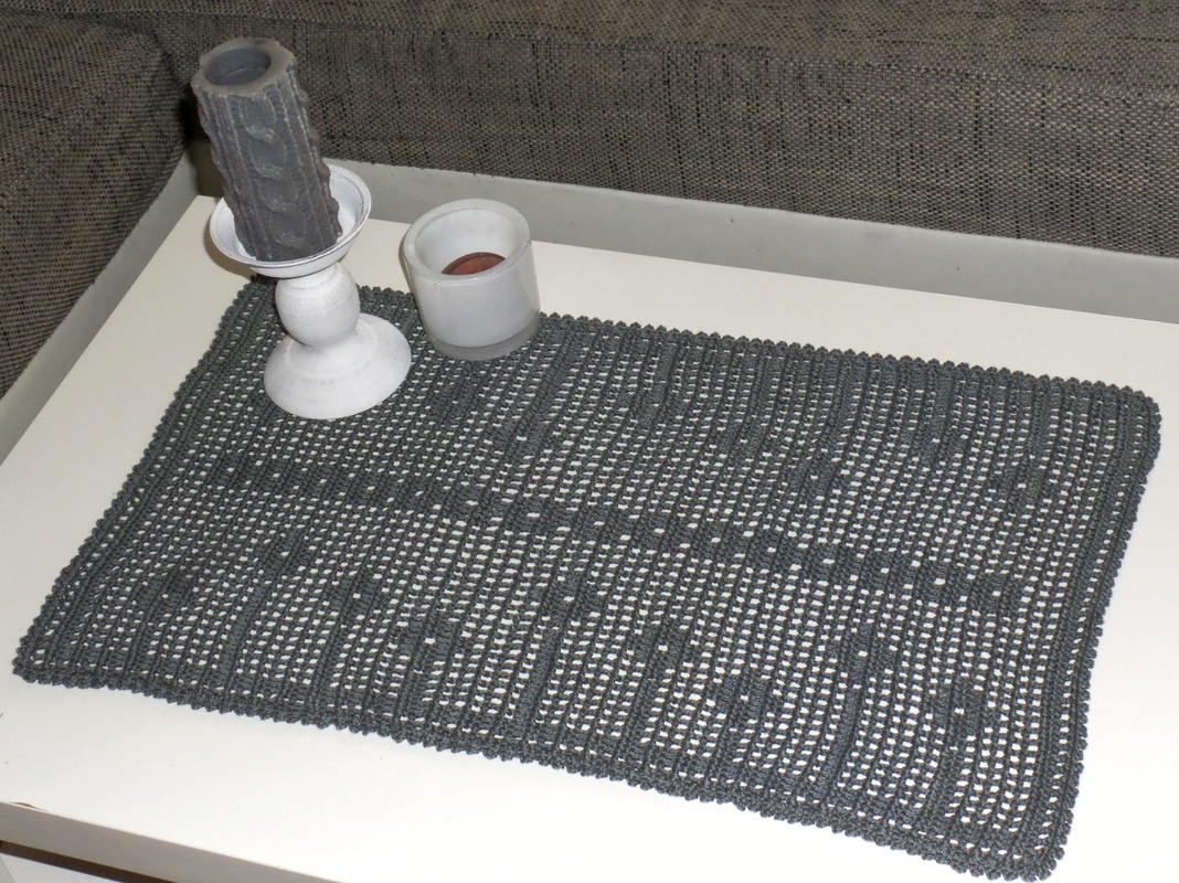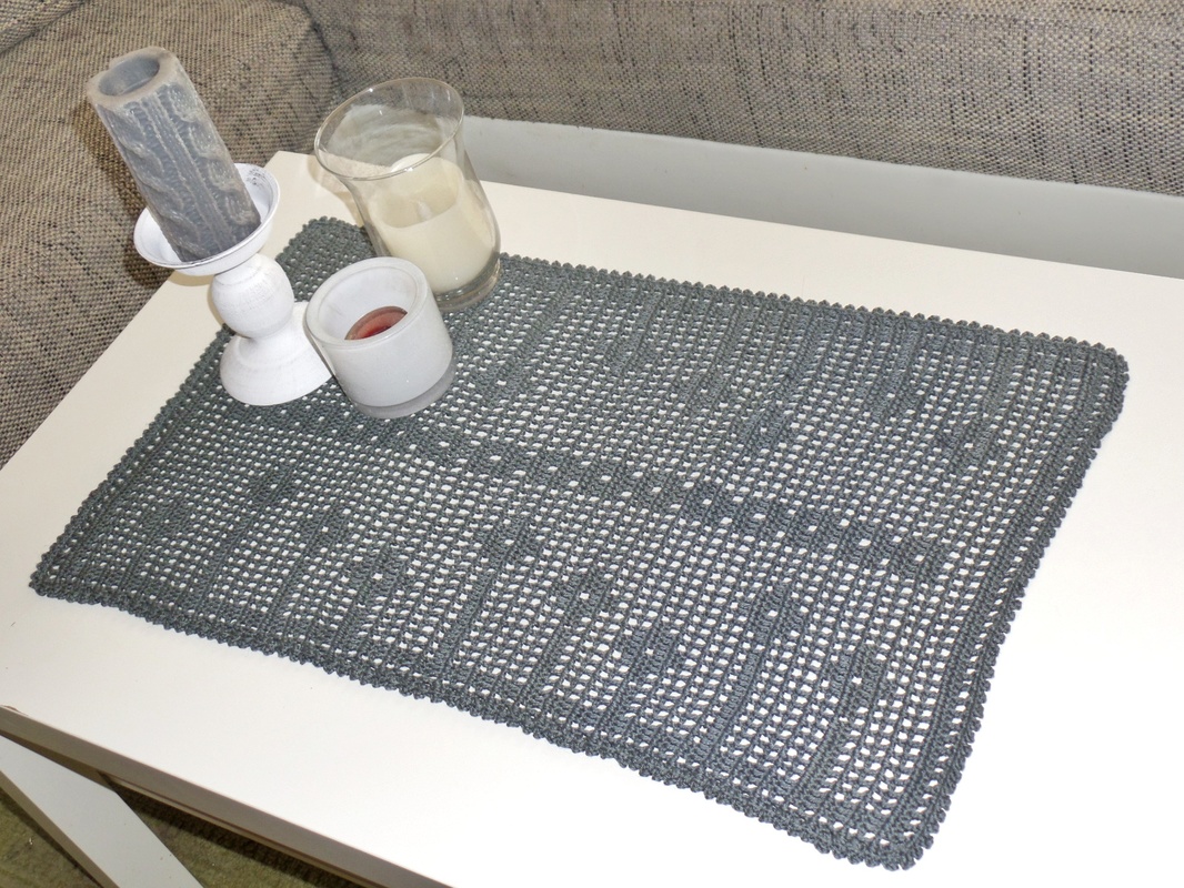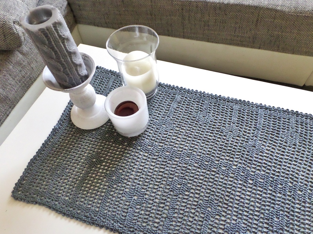So, jetzt schnappt Euch die Anleitung und häkelt los, der Läufer passt nicht nur für den heißersehnten Frühling und die Osterzeit, sondern durchs ganze Jahr. Ja, Osterzeit.. auch wenn ich den Läufer in tristem grau gehäkelt habe. Das ist allein der Tatsache geschuldet, daß sich hellere Farben ganz schlecht so fotografieren lassen, daß Ihr das Muster auf dem Foto gut erkennen könnt. Also scheut Euch nicht, andere Farben zu verwenden, Habt Ihr einen dunklen Tisch, wirkt eine helle Farbe viel besser.