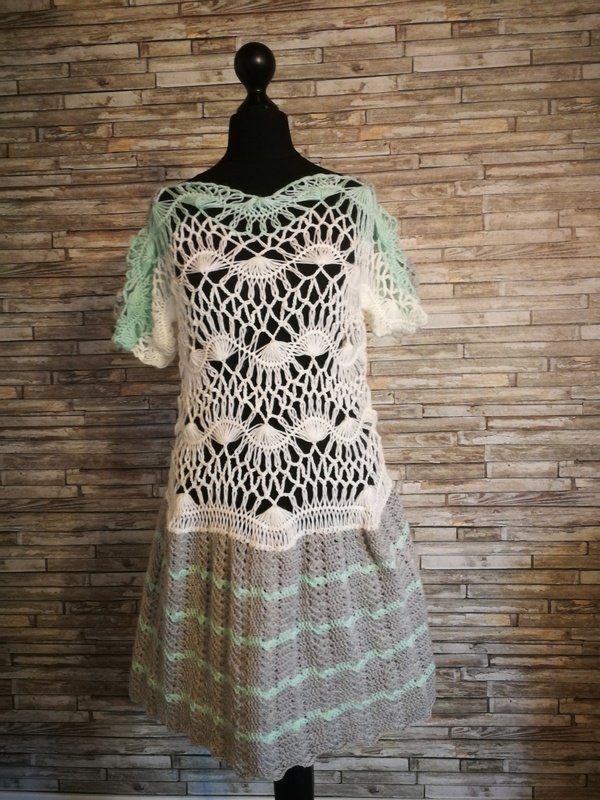Das Kleid "Wellentanz" ist ein Mix aus Gabelhäkelei und gehäkelten Maschen. Es ist sehr leicht anzufertigen und daher auch für Anfänger geeignet.