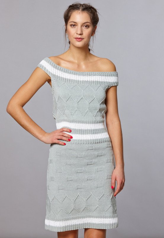 Lang Yarns "Nelly" (60% Baumwolle, 40% Polyacryl, LL ca 110 m/50 g): ca 350 (400) g Grau Fb 0023, ca 50 (100) g Weiß Fb 0001, Prym-Stricknd 4 mm und 4,5 mm, 1 Rundstricknd 4 mm, 80 cm lang.