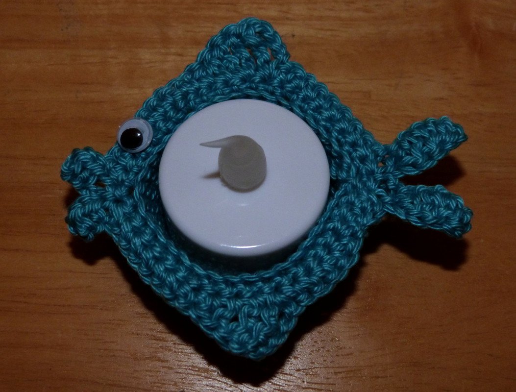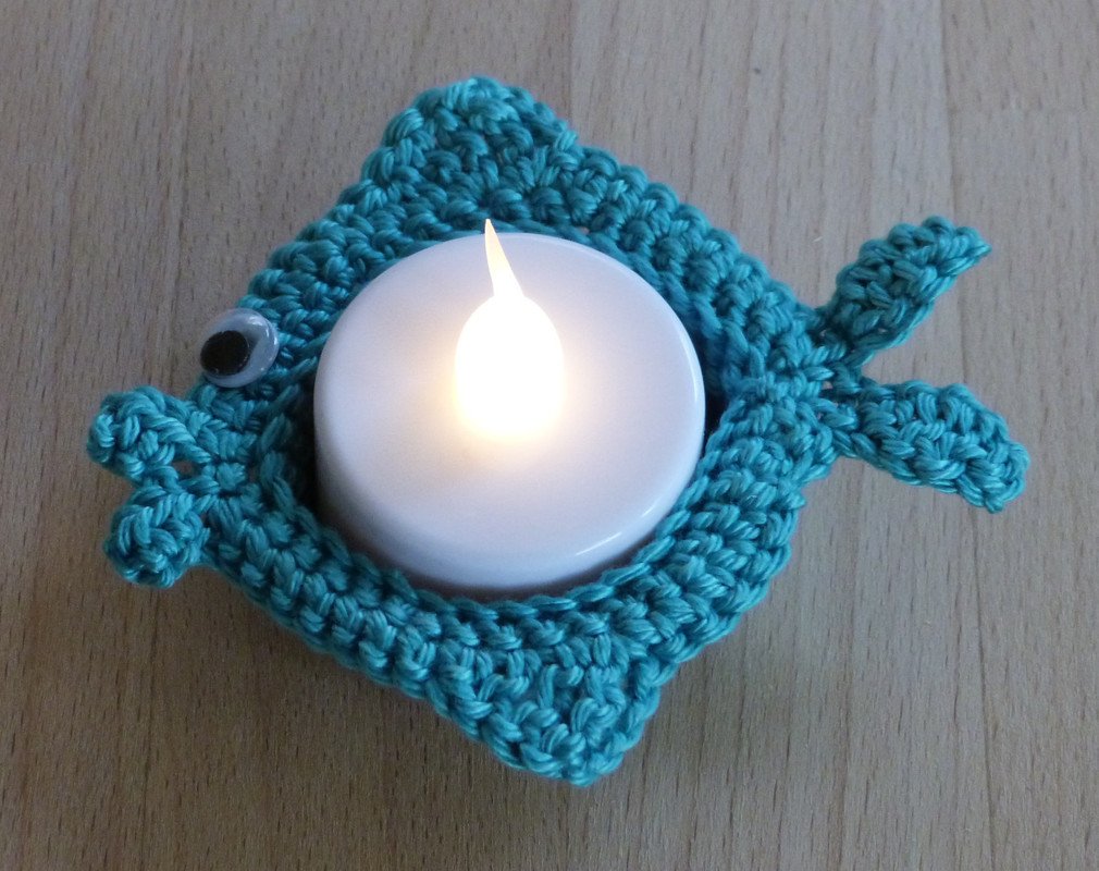 Bei Verwendung von Baumwollgarn mit einer Lauflänge von 125m/50g und Nadelstärke 2,5 passt der Halter für Teelichter mit 40 mm Durchmesser. Die Fische werden ca. 9 cm breit. Aus Sicherheitsgründen sollten nur elektrische Teelichter benutzt werden!